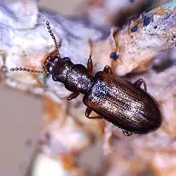 Salpingidae or narrow-waisted bark beetles is a family of beetles in the superfamily Tenebrionoidea.[1][2] The species are small, about 1.5 – 7 mm in length.[3] The family is globally distributed and consists of about 45 genera and 300 species, which are generally found in the temperate regions of both hemispheres. The family is mainly associated with plants (both living and dead) as well as with ascomycete and hyphomycete fungi. Some members of the family are associated with unusual habitats, like Aegialites and Antarcticodomus, which are found in coastal areas including the intertidal zone, with former feeding on algae.[4]