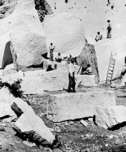 Sandstone was originally used for the foundation. During the Utah War, the foundation was buried and the lot made to look like a plowed field to prevent unwanted attention from federal troops. With the outbreak of the American Civil War in 1861, the troops were called away by December. In the spring, when the foundation was uncovered to continue work, it was discovered that many of the foundation stones had cracked, making them unsuitable to hold the weight of the massive temple.[21] Although not all of the sandstone was replaced, the inadequate sandstone was replaced. The walls are quartz monzonite (which has the appearance of granite) from Little Cottonwood Canyon, twenty miles (thirty-two kilometres) southeast of the temple site. Oxen transported the quarried rock initially, but as the Transcontinental Railroad neared completion in 1869 the remaining stones were carried by rail at a much faster rate.[23]