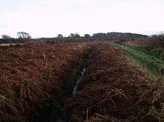 Salta Moss is a Site of Special Scientific Interest, both for its natural and historical significance, and is itself is located in a designated Area of Outstanding Natural Beauty[9] which covers much of the Solway Plain. The Moss is an area of peatland, containing "mainly oligotrophic semi-fibrous grass-sedge peat" according to Soil Survey Record.[10] It combines characteristics of both a raised bog and a valley mire, and lies atop deposits of glacial sand from the last ice age. It was designated an SSSI in 1954.[11] Having been cut with irrigation channels, and been the site of burning and peat working, Salta Moss has different flora than other bogs or mires on the Solway Plain.[11] The Moss today is common ground, but a track runs through it to provide access for local farmers to outlying fields, which surround it. An irrigation ditch has also been dug to provide drainage to the surrounding farmland.[11]