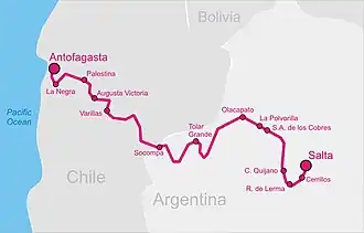 The Salta–Antofagasta railway, also named Huaytiquina,[2] is a non-electrified single track railway line that links Argentina and Chile passing through the Andes. It is a 1,000 mm (3 ft 3+3⁄8 in) metre gauge railway with a total length of 941 km (571 in Argentina[3] and 330 in Chile), connecting the city of Salta (Argentina) to the one of Antofagasta (Chile), on the Pacific Ocean, passing through the Puna de Atacama and Atacama Desert.