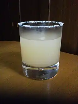 The drink is 2 fluid ounces of gin, or vodka, mixed with fresh grapefruit juice, shaken, and poured into a glass whose rim has been salted.[2]