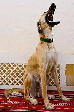 There is a type called "desert Saluki" or "Sinai Saluki" or "Hijazi Saluki", which descends from bloodlines brought directly from the original region of the breed. It exists in the entire Middle Eastern region but the origin is West of the Arabian Peninsula. In Israel the type is known as the "Negev Saluki".[14] The desert Saluki does not have influence of western lines and it tends to have a more primitive appearance. It often has a broader skull, shorter muzzle, shorter and more compact body, broader chest, less angulations, and shorter tail than the western equivalent. Some desert Salukis imported from the original region have cropped ears because of the common tradition in countries such as Iran, Iraq, Turkey, and Syria. However, it is difficult to strictly determine what desert Salukis originated from due to the "original" bloodlines being bred in the Western world for 4 to 5 generations.[15] The breed existed in the US by the 1980s and there has been breeding in France since the 1990s. The first desert Salukis in Finland were imported from Israel in February 2000.[16] After that, more have been imported from countries such as Syria, Oman, Qatar, and Turkey. In addition to their countries of birth, they have for example Iranian, Moroccan, Bahraini, and Saudi Arabian "Bedouin Saluki" dogs in their background.