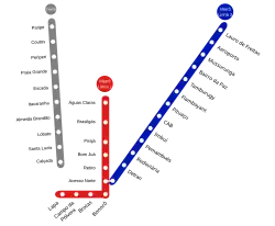 The Salvador Metro (Brazilian Portuguese: Metrô de Salvador, commonly called Metrô or Sistema Metropolitano Salvador-Lauro de Freitas) is a rapid transit system serving Salvador city, the state capital of Bahia and the fifth largest city in Brazil. The current system is 38 km (23.6 mi) long and has twenty two stations, which began partial public service on June 11, 2014.[2] The system also has a station at the Salvador Bahia Airport in Lauro de Freitas. It is operated by CCR METRÔ BAHIA Company.