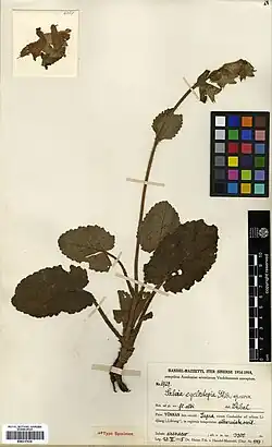 Salvia cyclostegia (the roundleaf sage) is a perennial plant that is native to forests, grasslands, and hillsides in Sichuan and Yunnan provinces in China, growing at elevations from 2,700 to 3,300 m (8,900 to 10,800 ft). The leaves are broadly ovate to circular, and range in size from 2.3 to 13 cm (0.91 to 5.12 in) long and 1.2 to 6.5 cm (0.47 to 2.56 in) wide.