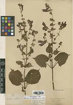 Salvia maximowicziana is a perennial plant in the family Lamiaceae.[2][3] It is found growing on grasslands, forests, and forest edges in China, at 1,800 to 3,300 m (5,900 to 10,800 ft) elevation. It grows 10 to 90 cm (3.9 to 35.4 in) tall, with circular-cordate to ovate-cordate leaves that are typically 3 to 8 cm (1.2 to 3.1 in) long and 6 to 8 cm (2.4 to 3.1 in) wide. The upper leaf surface is nearly smooth, or lightly covered with hairs, while the underside has glandular hairs on the veins.