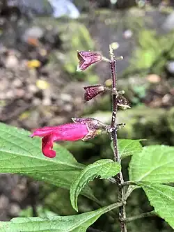 Salvia venulosa is a perennial plant that is native to a very small region of the Western Cordillera in Colombia. It grows at 1,500 to 2,000 m (4,900 to 6,600 ft) elevation in deeply shaded wooded gullies. S. venulosa grows less than 1 metre (3.3 ft) tall, with narrow ovate leaves that are 6 to 9 cm (2.4 to 3.5 in) long and 3 centimetres (1.2 in) wide, and violet on the underside. The flower is an unusual wine-red color.[1]