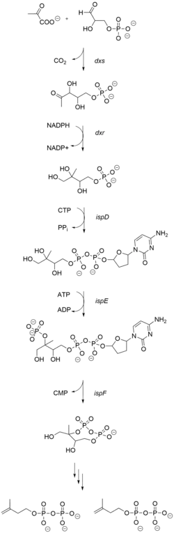 Terpenoids are biosynthesized from two 5-carbon precursors, isopentenyl diphosphate (IPP) and dimethylallyl diphosphate (DMAPP). The NMR and MS study by Zjawiony suggested that the biosynthesis of salvinorin A proceeds via the 1-deoxy-d-xylulose-5-phosphate pathway. In the deoxyxylulose phosphate pathway, D-glyceraldehyde 3-phosphate and pyruvate, the intermediates of the glycolysis, are converted into 1-deoxy-D-xylulose 5-phosphate via decarboxylation. Subsequent reduction with NADPH generates 2C-methyl-D-erythritol 2,4-cyclodiphosphate, via the intermediates 4-diphosphocytidyl-2-C-methyl-D-erythritol and 4-diphosphocytidyl-2c-methyl-d-erythritol-2-phosphate, which then lead to IPP and DMAPP.