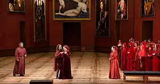 The 2015 opera program presented only three new productions—Le nozze di Figaro, directed by Bechtolf; Fidelio, directed by Claus Guth; and Wolfgang Rihm's rarely performed Die Eroberung von Mexico (The Conquest of Mexico), directed by Peter Konwitschny.[11] The remaining four opera productions—Norma, Il trovatore, Iphigénie en Tauride, and Der Rosenkavalier—were revivals. In 2018, Lydia Steier was the first woman to stage Die Zauberflöte.[12]