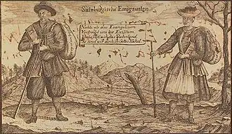 The Salzburger Emigrants were a group of German-speaking Protestant refugees from the Catholic Archbishopric of Salzburg (now in present-day Austria) that immigrated to the Georgia Colony in 1734 to escape religious persecution. This group was expelled from their homeland by Count Leopold Anton von Firmian (1679–1744), Prince-Archbishop of Salzburg. On October 31, 1731, he issued an Edict of Expulsion demanding from the Salzburg Protestants to recant their faith.[1] Pastor Samuel Urlsperger, the leader of the Society for Promotion of Christian Knowledge, called upon King George II of Great Britain for help. The King offered them refuge in his Georgia colony, which later became the town of Ebenezer.