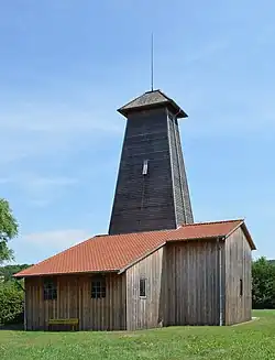 The start of salt extraction at the site began in 1757. A brine spring had been discovered in the proximity much earlier, in the medieval ages.[1] That was feasible because a Zechstein layer is located in the ground.[2] A graduation tower was built in 1772. From 1851 on balneotherapy was offered for guests.[3] In 1860 a drilling for brine was set as deep as 450m into the ground, replacing the graduation tower.[4] Also, a steam engine was installed to lift the brine to the surface. The steam engine replaced wind mills that had been in use until then. A second derrick was built in 1884. An electrical pump replaced the steam engine in 1920. Power transmission was achieved by line shaft. In the 20th century the facility was shut down, but the drilling tower was preserved and is an industrial heritage nowadays.
