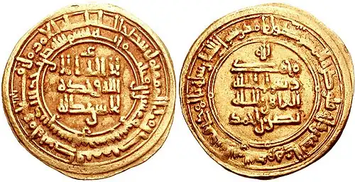Reverse in Arabic: la ilaha illa allah wahdahu la sharik lahu muhammad rasul allah al-muti' lillah al-malik al-muzaffar mansur bin nuh "There is no god but Allah, the One, there is no partner to Him, Muhammad is the messenger of Allah, al-Muti' lillah, the victorious king, Mansur son of Nuh.