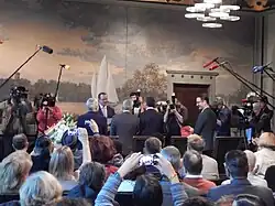 In late June 2017, whilst answering audience questions at a public forum in Berlin, Chancellor Angela Merkel unexpectedly stated that she hoped the question of same-sex marriage would be put to a conscience vote. This was widely interpreted to mean that she would allow a vote in the Bundestag on the matter without party whip control by the Union parties (CDU/CSU).[38][69] Shortly after her statement, several politicians, including the Leader of the Social Democratic Party, Martin Schulz, pressured for a vote to be held in the last week of June during the final legislative session before summer recess.[70][71] On 27 June, both Union parties announced that they would allow their lawmakers a conscience vote, although they opposed a vote being held before the federal election. The SPD de facto breached the coalition agreement and planned on voting with the opposition parties to legalise same-sex marriage.[72] On 28 June, SPD, Green, and Left members of the Legal Affairs Committee voted to schedule a plenary vote on the bill proposed by the Bundesrat in 2015, outvoting CDU/CSU members.[73][74][75][76] The Greens and The Left withdrew their own respective bills.[77][78]
