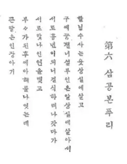 ![]() First six lines of the first known transcription of the Samgong bon-puri, published in 1937.[1] | |