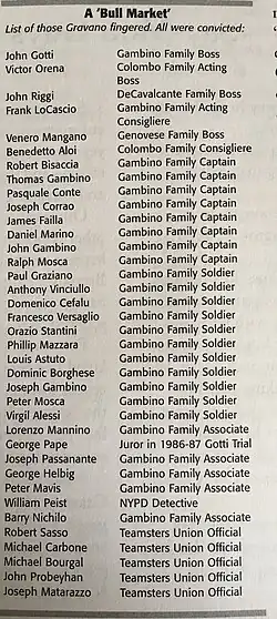 - ^ Lubasch, Arnold (3 March 1992). "Gotti Confidant Tells Courtroom Of Mafia Family's Violent Reign". The New York Times. Retrieved 20 July 2024.