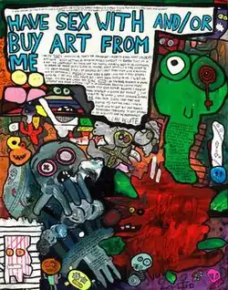 thrashLife's art is characterized by bright colors, "funny faces,"[12] and – as one journalist noted – "phrases and at times, paragraphs, of honesty ... raw accounts of his every day life; be it good, bad, or ugly."[13] Visually, he's garnered comparisons to Jean-Michel Basquiat[14] but the text written across his canvases more directly (and in great detail) addresses his issues with girls, love, sex, self-esteem, anxiety, and identity.[15] In a biographical article for Folio Weekly, Janet Harper wrote, "Sam's openness with his art, and with perfect strangers, could be off-putting, the way he lets his guard down almost instantly and chats easily about the darkest parts of his life. He's open about his mental illness and drug addiction. About his issues with women and his need to be accepted and adored ... But Sam's brutal honesty, always with a dose of narcissism and boyish charm, makes it easy to be comfortable around him, and to trust him ... It's a rare trait, and one that leaves an impact on almost everyone he meets. He gives so much of himself, both through his art and the short biographical stories he includes with each piece – which is exactly why it's selling."[14]