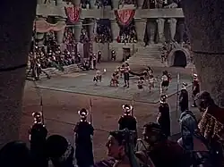 The film's special effects were supervised by Gordon Jennings.[70] The most spectacular special effect in the film is the toppling of the temple of Dagon, the god of the Philistines.[70] It is the penultimate scene in the film, cost $150,000, and took a year to shoot.[70] The bottom portion of the temple was constructed full-scale.[70] A separate 37-foot high model with a 17-foot high Dagon statue was built for the photographic effects.[70] The model was destroyed three times to shoot it through different camera angles.[70] Footage of the full-scale set was merged with footage of the scale model using a "motion repeater system" fabricated by Paramount, which enabled the exact repetition of camera moves.[70]