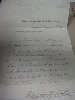 On March 13, 1882, Blatchford was nominated as an associate justice of the United States Supreme Court, by President Chester A. Arthur, to a seat vacated by Ward Hunt,[6] after two other candidates, Senator George F. Edmunds and former Senator Roscoe Conkling, declined. He was confirmed by the United States Senate on March 22, 1882,[7] and was sworn into office on April 3, 1882.[1] Blatchford thus became the first person to serve at all three levels of the federal judiciary—as a District Judge, a Circuit Judge, and a Supreme Court Justice. When he was nominated for the Supreme Court, it was estimated that his personal wealth exceeded $3 million (over $90 million in 2025), mostly held in real estate.[2]