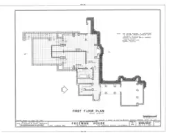 The Freemans may have heard about Wright from Harriet's sister Leah Lovell, an acquaintance of Aline Barnsdall, who owned the then-recently-completed Hollyhock House.[7][89] According to the scholar Dean Harris, the Freemans may have liked Wright specifically for his polemical way of speaking.[3] Wright completed a set of drawings during January 1924;[7][90] the initial plans called for a structure with cantilevered design elements, such as a roof and floor, extending outward from vertical concrete piers.[91] The next month, Wright made technical modifications to the plans.[91][90] The Freeman family initially intended to spend $10,000 on the house,[3][92] and Sam Freeman and Wright signed a contract on January 26, 1924.[59] The Freemans set aside $9,100 for construction,[14][59][93] and another $900 went toward Wright's architectural commission.[4] The Freemans hired H. J. Wolff as the house's contractor on January 29, but Wolff never did any work on the house.[59] Instead, work was delegated to Frank's son Lloyd;[94][95] the Freemans claimed that there were various delays as a result of Lloyd's involvement.[3]