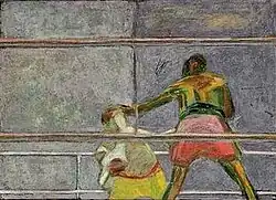 Little of Rabin's work from before his time at Goldsmiths College survived his critical destruction and an accidental destruction by a wartime landlady. Much of what exists are figure studies prepared as demonstrations for students and coloured boxing scenes produced with thickly applied wax crayons of his own making. Rabin exhibited rarely, but had a retrospective at Dulwich Picture Gallery in 1985–86.[1] He also exhibited at Southampton City Art Gallery 8 Feb – 23 March 1986 and Salford Art Gallery 17 April – 23 May 1986.