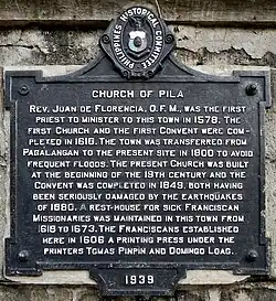 The first missionaries in Pila were Augustinians who administered their missions from Bay.[4] The Franciscans then started to evangelize the townsmen of Pila through Fray Juán Portocarrero de Plasencia and Fray Diego de Oropesa de San José (known as the Apostles of Laguna and Tayabas[2]) in 1578.[3][5] They started to establish "Villa de Pila" and soon built a church out of cane, dedicated to Saint Anthony of Padua.[6] From being a reducción, Pila was elevated to a parish on the feast of its titular on June 13, 1581, with Fray Oropesa as its pastor (parish priest) until 1583.[2] With its establishment, Pila became the first church dedicated to Saint Anthony in the country.[7] The Spanish colonial authorities gave Pila the title La Noble Villa de Pila. In 1599 permission was given by the Superior Gobierno to build a stone church.[6] In 1617 the stone church and rectory was finished in Pagalangan (place of reverence).[6]