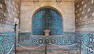 The entrance from the courtyard has a pointed arch with a few simple decorations while the other entrance, also pointed, has zigzag or sawtooth decorations. Two small columns bearing Islamic decorations with scrolls and leaves support the elegantly rib-vaulted ceiling. The interior walls are richly decorated with yeseria plasterwork and tiling while the floor is also decorated with alternating tiles. The wall decorations combine depictions of plants, geometric patterns and heraldry. The coats of arms belong to the Knights of the Band, an order created by King Alfonso XI. Inscriptions are in both Kufic and Naskh scripts.[2]