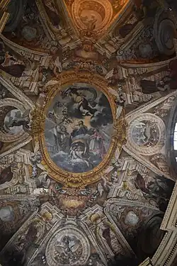 In the center oval, Avanzi painted the Glory of the Virgin with Saints Maurelio and Carlo Borromeo. The lunette over the entrance has a San Carlo painted by Antonio Bonfanti.[6]
