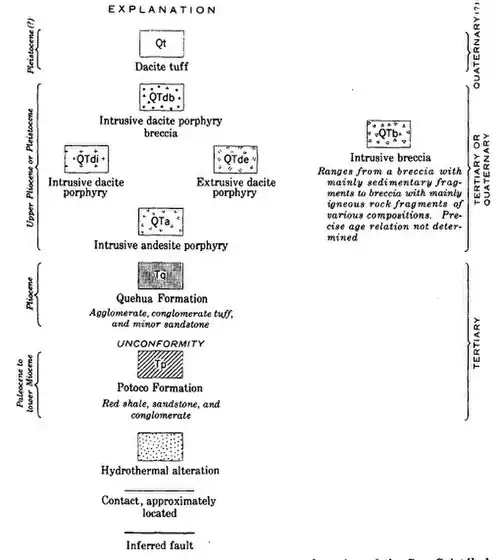 The geologic history from Tertiary and Quaternary periods includes 1) deposition and folding of the Potoco Formation, 2) erosion of this formation, 3) deposition of the Quehua Formation, 4) intrusion of the andesite porphyry stocks, 5) hydrothermal circulation altering rocks and depositing oxide-siderite-barite veins containing silver, 6) intrusion of dacite porphyry stocks, uplift of the Potoco and Quehua Formations, and deposition of dacite porphyry lava flows, 7) intrusion of breccia pipes and faulting, 8) deposition of dacite tuff, 9) hydrothermal circulation altering rocks and depositing galena, sphalerite, pyrite, native silver and barite, 10) erosion.[4]: 10