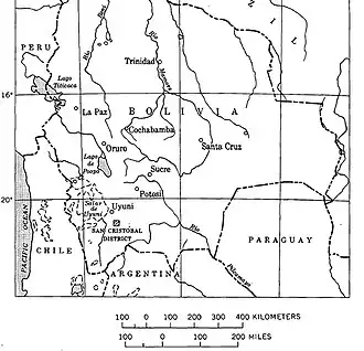 - ^ a b Jacobson, H.S., Murillo, C., Ruiz, L., Tapia, O., Zapata, H., Alarcon, H., Delgadillo, E., and Velasco, C., 1969, Geology and Mineral Deposits of the San Cristobal District, Villa Martin Province, Potosi, Bolivia, USGS Bulletin 1273, Washington: US Government Printing Office