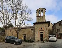 Documents date a church at the site from 1192, but much of the church was rebuilt in 1575 after a fire, and modified over the centuries. The rustic facade is awkwardly place relative to the nave. In the apse, some 14th-century frescoes still survive, depicting the Crucifixion, the Annunciation, the Ascension, and Christ blessing with Angels. The brick roof structure that holds the bells was built in the 15th century. The interior contains a restored 19th-century organ by Giovanni Banci.[1]