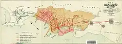 Transbay service began on October 26, 1903,[4] with a four-car train carrying 250 passengers, departing downtown Berkeley for the ferry to San Francisco.[5] Before the end of 1903, Frank C. Havens, the general manager of the SFOSJR, devised the idea of using a stylized map on which the system's routes resembled an old-fashioned key, with three "handle loops" that covered the cities of Berkeley, Piedmont (initially, "Claremont" shared the Piedmont loop) and Oakland, and a "shaft" in the form of the Key pier, the "teeth" representing the ferry berths at the end of the pier. The company touted its 'key route', which led to the adoption of the name "Key System".[6]