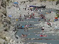 At least 26 Tongva villages were located along the San Gabriel River, and another 18 close by.[52] One of the largest Tongva villages, Asuksangna (meaning "place of the grandmothers") was located at the mouth of the San Gabriel Canyon. The West Fork of the San Gabriel River Canyon formed part of a trade route that crossed the San Gabriel Mountains, enabling the Tongva to trade with the Serrano people in the Mojave Desert to the north.[48] Many other villages were located near the San Gabriel River. The San Gabriel Valley, with its fertile soils and higher rainfall than the coastal plain, had the highest population density. Villages in the San Gabriel Valley included Alyeupkigna, Amuscopopiabit, Awingna, Comicranga, Cucamonga, Guichi, Houtgna, Isanthcogna, Juyubit, Perrooksnga, Sibagna, and Toviseanga. The village of Sejat was located at the Whittier Narrows. Puvugna was situated around present-day Long Beach, near the river's mouth.[53]