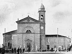 The original parish church was erected in 1856 using designs by Filippo Morolli, but it was destroyed during World War II. The reconstruction, while modeled on the prior church, is a modern reinterpretation, completed in 1950, by the architect Luigi Campanini. Many of the prior artworks were destroyed, including a canvas by Francesco Brici depicting San Gaudenzo. The church now houses a canvas by Angelo Sarzetti, originally in a Convent of Rimini. The portal has a sculptural group depicting San Gaudenzo blessing by Elio Morri (1913-1992).[1]