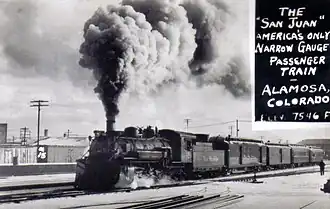 The San Juan Express (also known as simply the San Juan) was a narrow gauge train that ran on the 3 feet (0.91 m) Denver and Rio Grande Western Railroad (D&RGW) route from Durango, Colorado via Chama, New Mexico; Cumbres Pass; and Antonito, Colorado to Alamosa, Colorado. The train ran from February 11, 1937 until January 31, 1951 as train numbers 115 and 116, though towards the end of the passenger service it took on the number 215 and 216.[1]