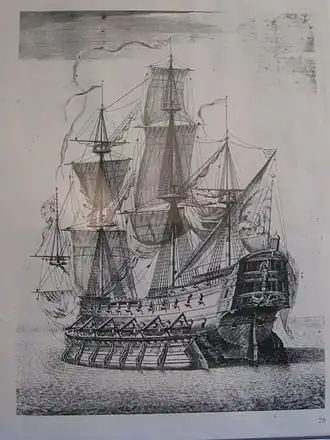 To solve this problem, in 1702 Fabio Bonvicini, that had been Capitano Ordinario delle Navi during the war and was now a Senate member, proposed to build longer ships with thicker frames, able to carry 50-pounder guns, with reduced beam and smaller decks height.[12] Only in 1708, winning the opposition of Arsenal's master builders, was laid down a ship that corresponded to Bonvicini suggestion, the Corona, launched in November 1711, but, due to arguments over the danger posed by rough sea to the big first rate ships, it was not replicated.[13]