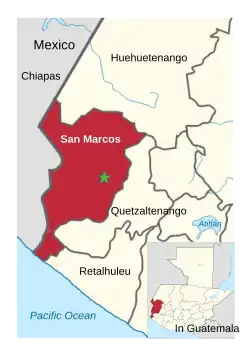 The department was created by a governmental decree on 8 May 1866, together with Huehuetenango, Izabal and Petén departments.[2] In 1902 the eruption of the Santa María volcano in the neighbouring department of Quetzaltenango was responsible for the destruction of the twin towns of San Marcos and San Pedro Sacatepéquez.[6] The towns were rebuilt and in 1935 were joined to form the new municipality of San Marcos La Unión.[6] This new municipality did not last long and the unified municipalities were again split in 1945 with San Marcos remaining the departmental capital.[6]