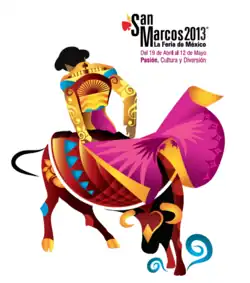 The Feria Nacional de San Marcos (National Fair of Saint Mark) is a national fair held in the Mexican state of Aguascalientes every year for three (or sometimes four) weeks. Most of the events occur in the city of Aguascalientes, the state capital. The exact date of the fair varies every year, but is set around April 25, the Feast Day of St. Mark.