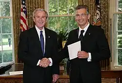 The two countries are on excellent terms, with San Marino consistently supporting U.S. foreign policy positions as well as U.S. candidates to international organizations. In September 2006, President George W. Bush appointed Ambassador to Italy Ronald P. Spogli to serve concurrently as Ambassador to San Marino; Spogli is the first U.S. Ambassador to San Marino in the country's history. For consular purposes, the republic is within the jurisdiction of the Florence consular district. Consulate officials regularly visit San Marino to carry out diplomatic demarches, represent U.S. interests, and administer consular services. As of August 2023, Jack Markell is the U.S. ambassador to San Marino (and Italy). In July 2007, Ambassador Paolo Rondelli became San Marino's first ambassador to the U.S.[6]