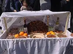 On the morning of the second day, before the patronal procession, mattre (tables for the poor) are prepared and blessed by the parish priest. The mattre were originally offered to the poorer communities of the town but today it is generally offered to everyone including tourists. The Tables of Saint Joseph, which reference the Last Supper, are also prepared. Thirteen loaves of bread are prepared and set out on tables.[28]