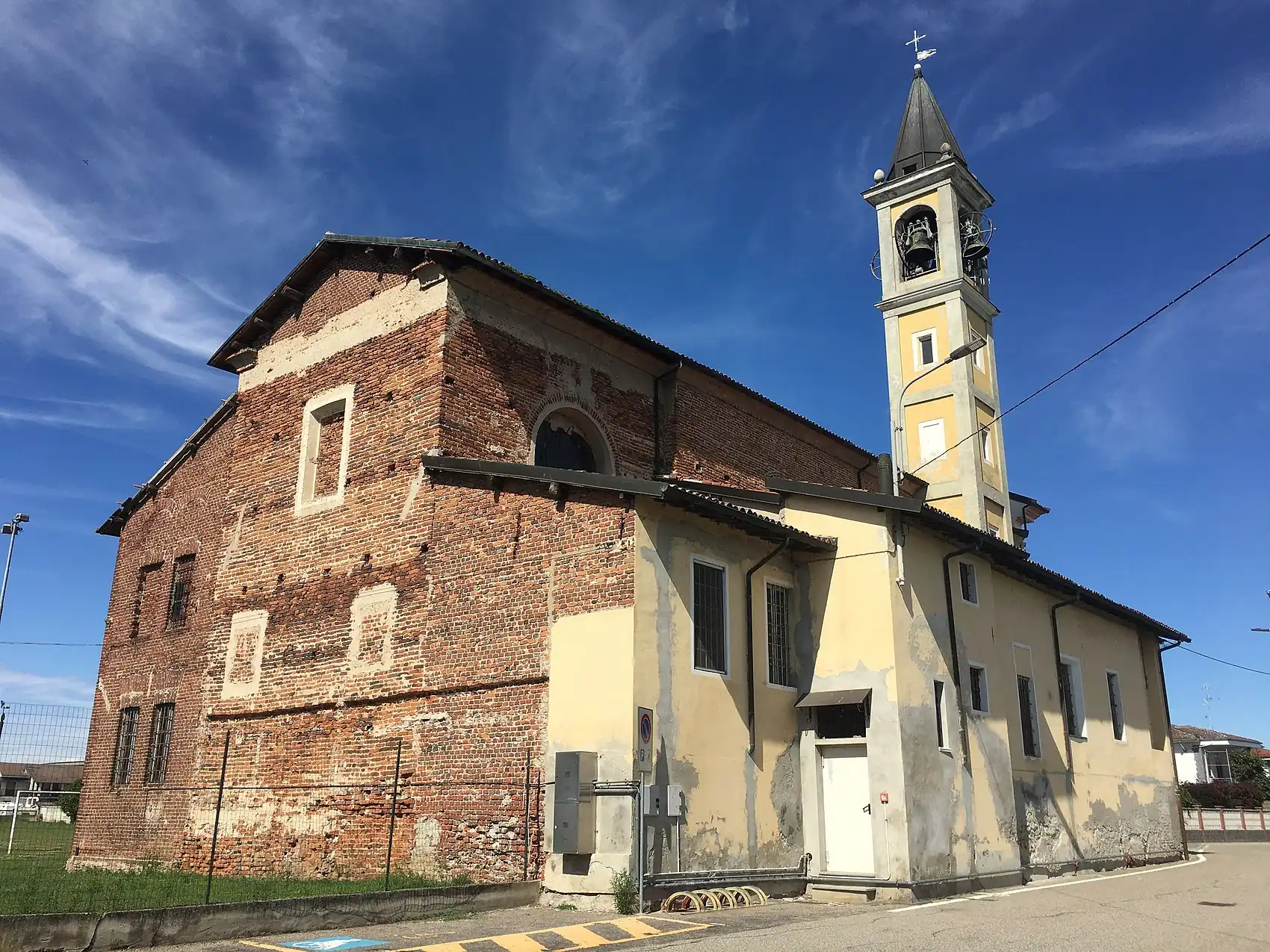 With the growth of the population, its small size made replacement necessary in the late 16th century. The original Lombard building was demolished, and its foundations were reused for the construction of the new one. The report from the pastoral visit of Bishop Carlo Bascapè on May 2, 1596 (when the work was still incomplete), along with the 1618 document concerning the transfer of the parish benefice, provides a detailed description of the new structure: it measured twenty-eight braccia in length (including the choir), twelve in width, and ten in height (one braccio — arm — equates to approximately 60 cm[11]); it consisted of a single nave with a wooden ceiling and a bell tower thirty braccia high, located to the left of the choir. The choir itself was semicircular and, like the earlier structure, faced east.[12][13][2][7] To the north were the clergy house, sacristy, and cemetery; to the east, the access road; to the south, the rectory garden; and to the west, the rectory's vineyard and fields. Inside, the ceiling was painted, and the altar was made of inlaid wood, surmounted by a gilded wooden tabernacle two braccia high, supported by four angels, accompanied by six candlesticks and a small cross.[7]