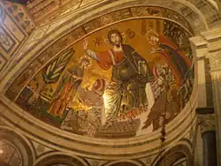 The raised choir and presbytery contain a magnificent Romanesque pulpit and screen made in 1207. The apse is dominated by a great mosaic of Christ between the Virgin and St Minias on its vaulted ceiling dating from 1297; the same subject is depicted on the façade of the church and is probably by the same unknown artist. The crucifix above the high altar is attributed to Luca della Robbia. The sacristy is decorated with a great fresco cycle on the Life of St Benedict by Spinello Aretino (1387).