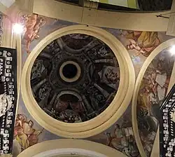 A dome was planned for the building but this was never built, and in its place there is a flat ceiling with a trompe-l'œil simulating a dome.[3]