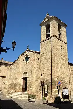 The front portal has a rounded arch. It is surmounted by a simple oculus and flanked by two rustic pilasters emerging from the brick facade. Internally the church with its three naves, separated by thick columns and three semicircular apses. A series of low pointed Gothic arches, as well as the short thick pillars, all belong to the 13th-century reconstruction.[1] A fresco (circa 1440) by Andrea De Litio is painted above the baptismal font on the counterfacade, depicting the Madonna of Loreto among angels and Saints Roch and Sebastian.[2]