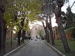 The basilica was built by Pope Symmachus (498–514), on the place where the body of the young martyr Saint Pancras of Rome, or Pancratius, had been buried, Via Aurelia miliario secundo ('on the Via Aurelia at the second milestone'). The church was originally placed by him under the care of the clergy of the Church of S. Crisogono. Due to their neglect of the site, Pope Gregory I (590–604) handed it over to the members of the newly founded Benedictine Order after the Lombards sacked their monastery of Montecassino in 580.[1] In the seventh century Pope Honorius I (625–638) built a larger church for the increasing numbers of pilgrims; he placed the relics of the saint beneath the high altar, with a window of access from a semi-circular corridor that led behind and below the altar.[2] In the 17th century, it was given to the Discalced Carmelites, who completely remodeled it. The church underwent further rebuilding in the 19th century, having been heavily damaged during the French attack on the incipient Roman Republic in 1849; but it retains its plain brick facade of the late 15th century, with the arms of Pope Innocent VIII.[3]