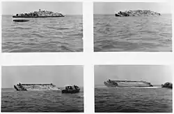 Natural islands in San Pedro Bay include Terminal Island (actually an augmented mudflat and Rattlesnake Island),[6] the site of much of Los Angeles' and Long Beach's port facilities, Mormon Island, the site of an abortive settlement attempt by San Bernardino-based Mormon pioneers in the 1850s, and Smith's Island.[7] Land reclamation operations by Los Angeles have considerably enlarged Terminal Island, as well as linking Mormon Island to the mainland. Deadman's Island sat at a landmark at the foot of the bay, but was removed in 1928 as part of the effort by Phineas Banning to enlarge the harbor. In 1927 an airport, originally called Allen Field and later Naval Air Station Terminal Island, was built on San Pedro's Terminal Island.[8][9][10]