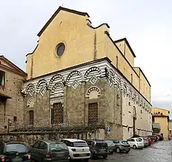 San Pier Maggiore is an originally Romanesque-style, former Roman Catholic church in Pistoia, region of Tuscany, Italy. The church is notable for polychrome decorations that partially decorate the ground floor of the exterior, similar to that see in the church San Giovanni Fuorcivitas.