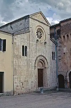 A church and Benedictine abbey at the site is documented from the 12th century. An inscription below the facade tympanum mentions the name Atto who may the master involved in the construction of San Lorenzo in Spello and the Duomo of Foligno during 1120-1140.[1] For the next three centuries, the abbey was torn by competing ownership by different orders and institutions. It is said St Francis and his follower Pacifico stayed at the abandoned abbey in the early 13th-century.[2] In 1484, the abbey was granted to the Olivetan order, and remained so until suppressions in the 19th century. The church is now a parish church.