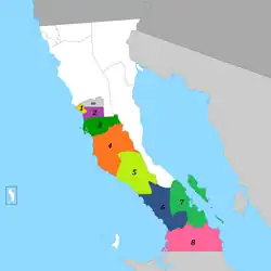 1. Camalú 2. Vicente Guerrero 3. San Quintín 4. El Rosario 5. El Mármol 6. Punta Pietra 7. Bahía de los Ángeles 8. Villa Jesús María.