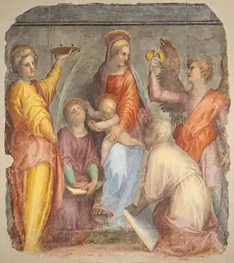 An early work by the artist, produced soon after finishing his training Andrea del Sarto's studio, it is now owned by the Accademia delle arti del disegno. At least three preparatory drawings for it survive in the Kupferstich-Kabinett, Dresden,[2] the Biblioteca dell'Accademia Nazionale dei Lincei e Corsinianain Rome[3] and the Uffizi's Gabinetto dei Disegni e delle Stampe. The two framing standing figures are saint Lucy (left) holding up a plate with her eyes and Michael the Archangel holding a pair of scales by the cups. Either side of the Madonna and Child kneel Saint Agnes and Zechariah.