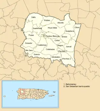 Like all municipalities of Puerto Rico, San Sebastián is subdivided into barrios. The municipal buildings, central square and large Catholic church are located in a barrio referred to as "el pueblo".[9][10][11][12]