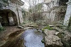 San Vittorino is a Baroque former Roman Catholic church in Cittaducale, province of Rieti, region of Lazio, Italy. Soon after completion in 1613, the church collapsed into a sinkhole, and the roofless ruins remain, with the facade sheltering a mineral-water pool that streams out the former portal. The combination of ruins and nature create an air of mystery; the church was used in some of the scenes of the movie Nostalghia.